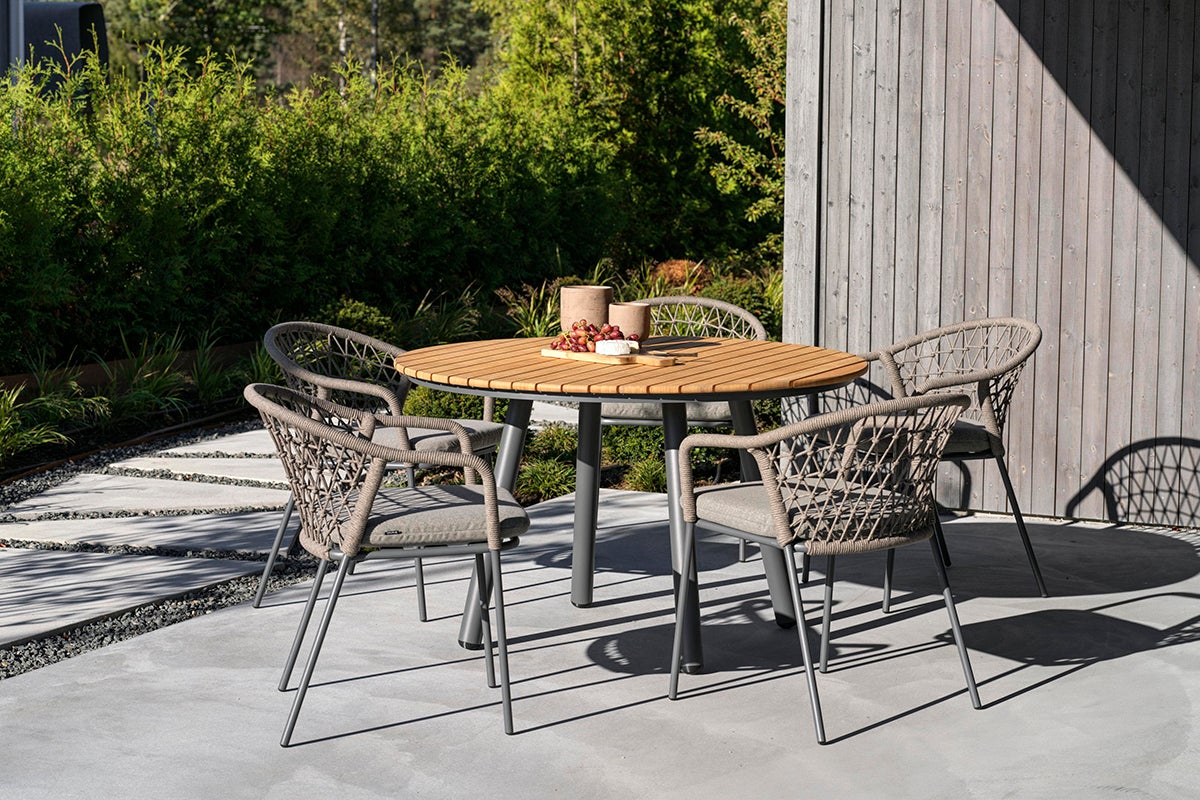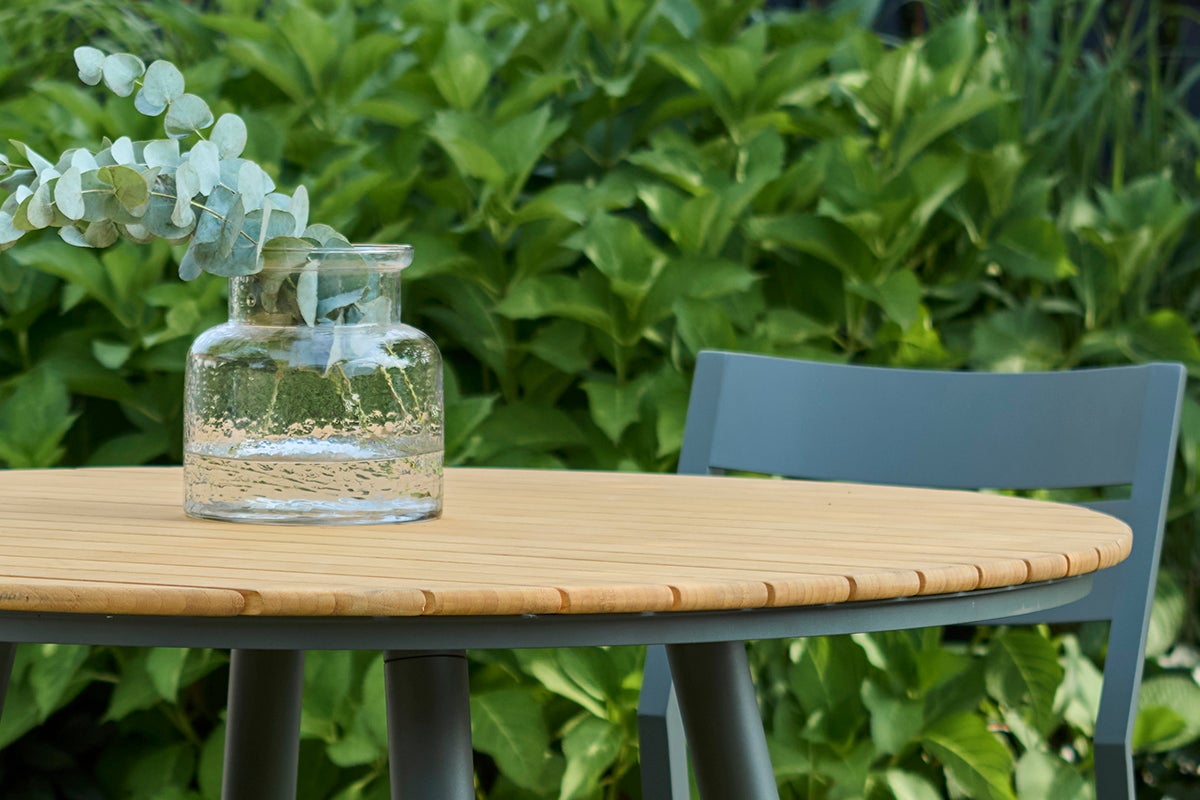 Design og håndverk i perfekt harmoni med Bam Bo rundt bord, et fint eksempel på moderne eleganse. Sjenerøs, rund form fremhevet av vakre bambusribber, alle hviler på en aluminiumsramme med fire ben.