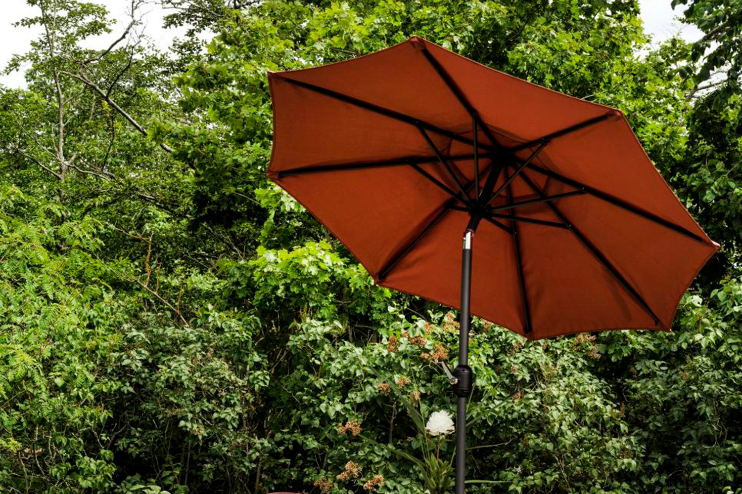 Parasoll med 2-delt aluminiumsstang og 8 stållameller. 200 gr polyesterstoff med ventilasjonsklaff. Sveiv funksjon.