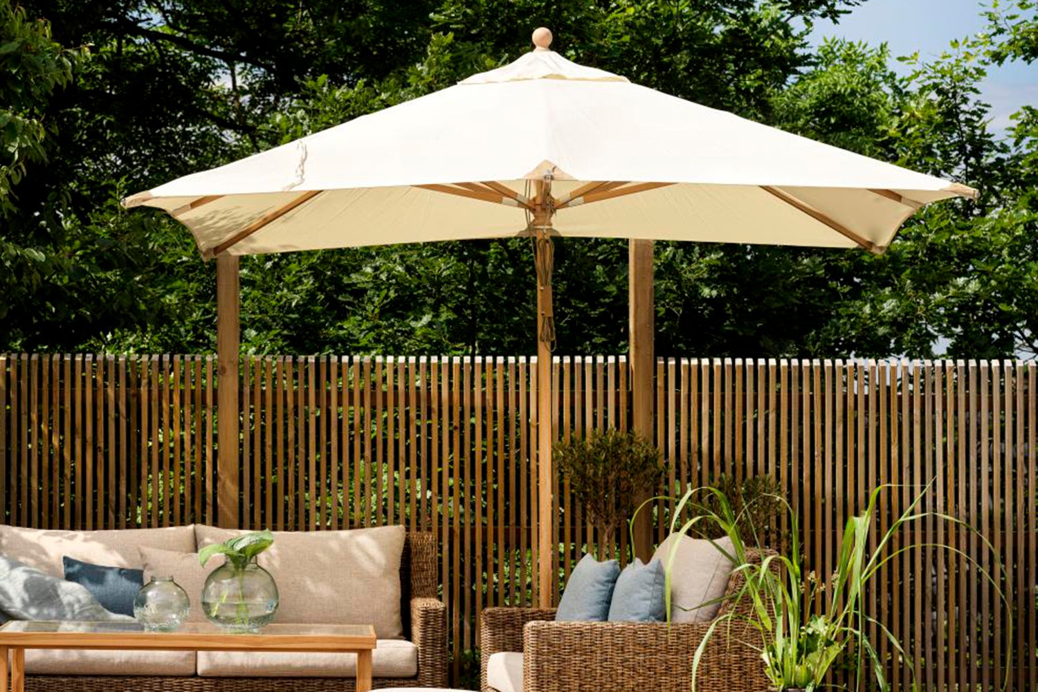 3x3 m parasoll laget av FSC-merket tre (Sycamore) med mattlakkert overflate. Vakre skinnmaljer og stoff laget av 250 g polyester.