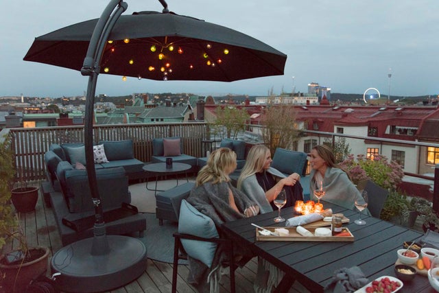 Easy sun er en enorm fritthengende parasoll med en diameter på 3,75 m. Rammen er laget av aluminium og kalesjen er laget av slitesterk olefin med vindskjerm. Foldes enkelt opp og ned ved hjelp av en sveiv. Basen er fylt med sand og/eller vann for stabilitet.