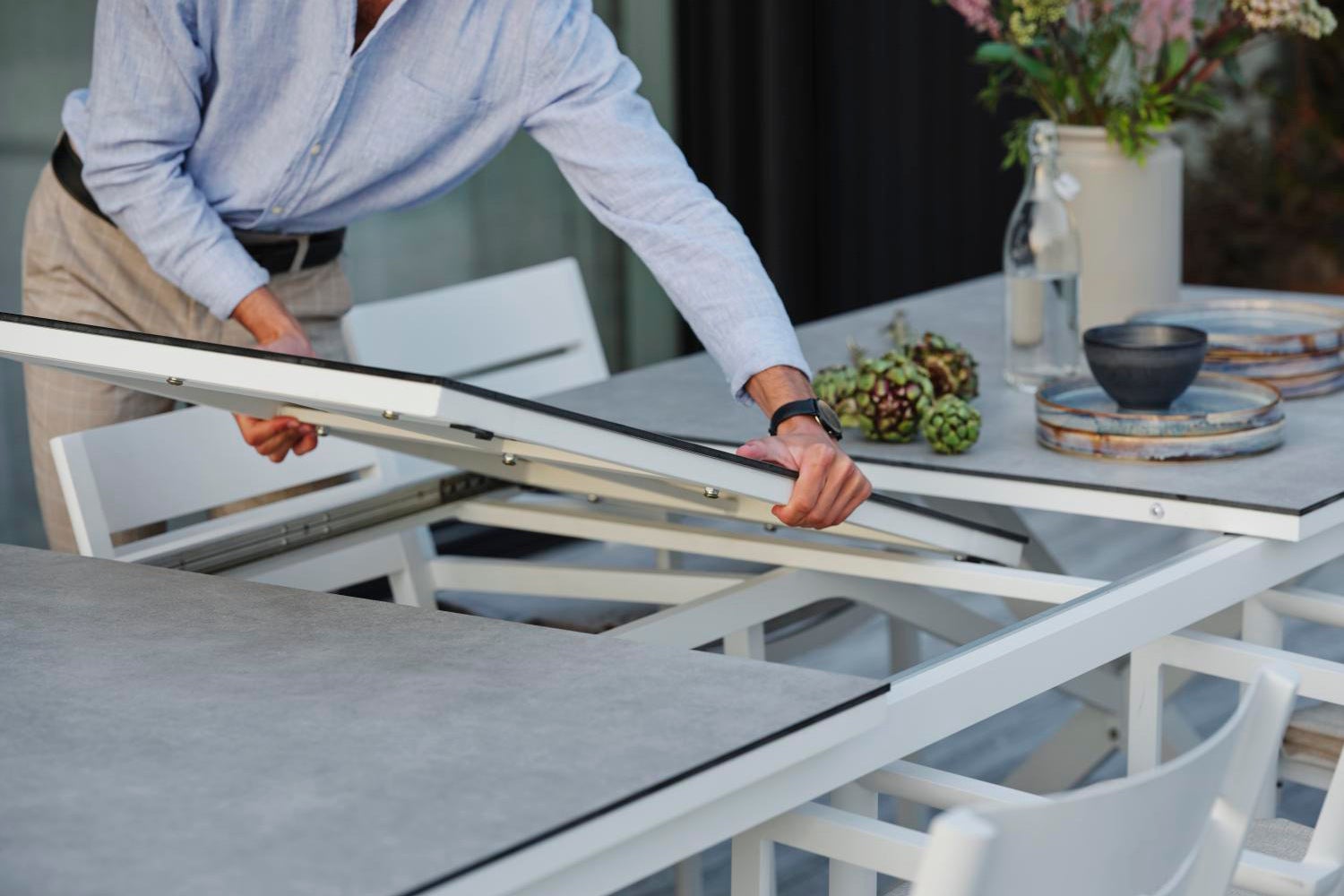 På tide å samle venner og familie til en virkelig herlig fest? Da er Hillmond uttrekksbord det perfekte valget. Enten velger du vårt lengste uttrekksbord som har plass til minst 12 personer, eller så velger du den mindre varianten som 8-10 personer kan samles rundt. Bordet har en base av lakkert aluminium, og til bordplaten kan du velge enten tverrgående aluminiumslameller med preget tremønster eller en av våre tremønstrede laminatplater.