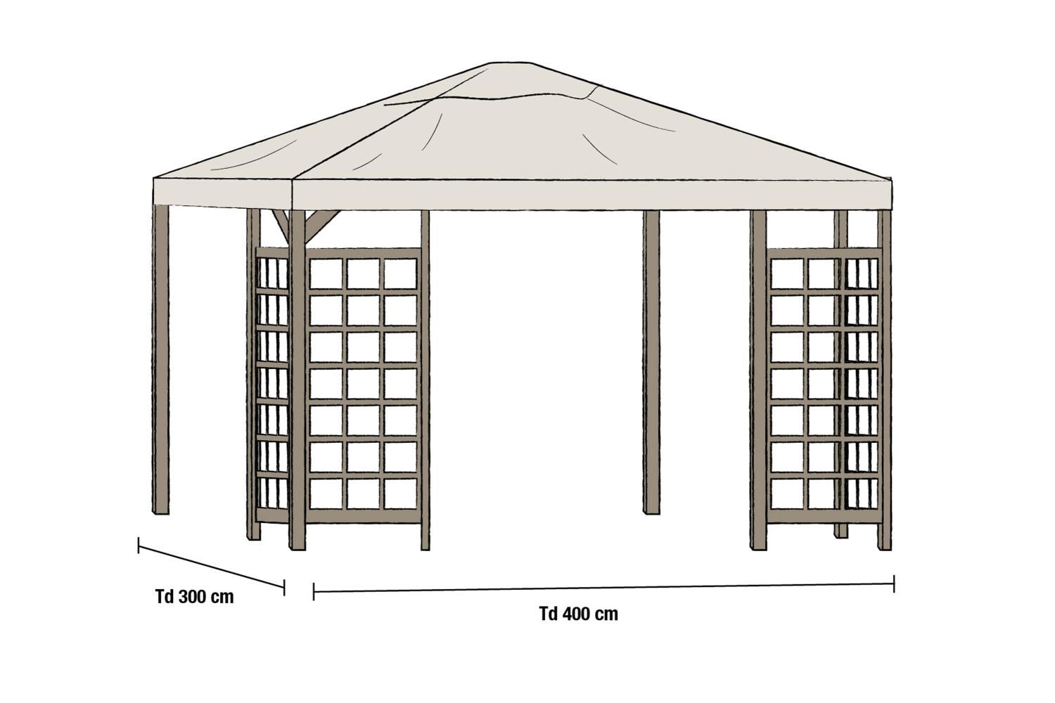 En praktisk paviljong som gir beskyttelse mot regn, sol, vind og irriterende insekter hvis du supplerer med sidevegger eller myggnett. En solid fururamme holder det regnbestandige taket, som er tilgjengelig i forskjellige farger. Tredetaljene er beiset og finnes i forskjellige farger. Tak, vegger og espalier kjøpes separat.