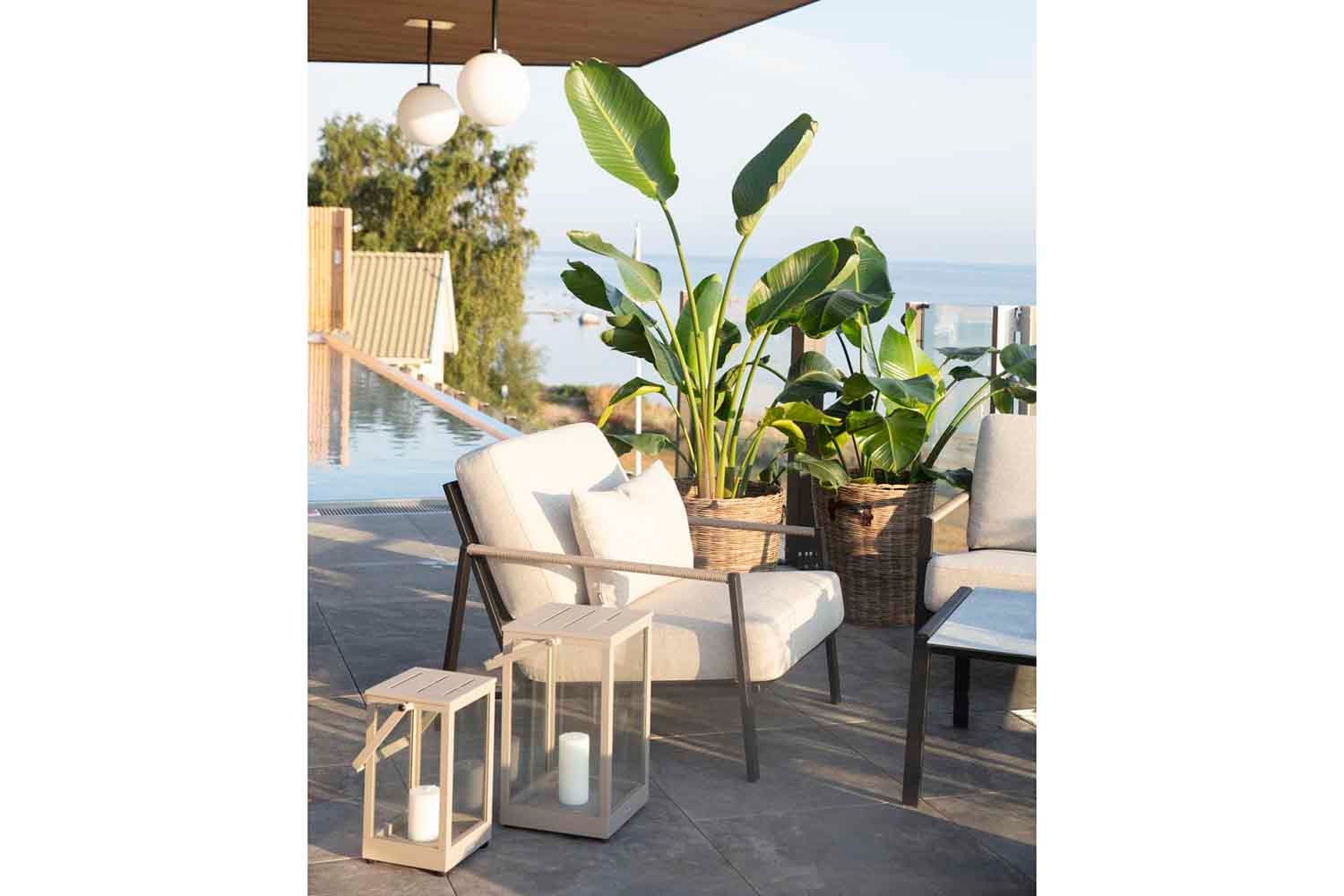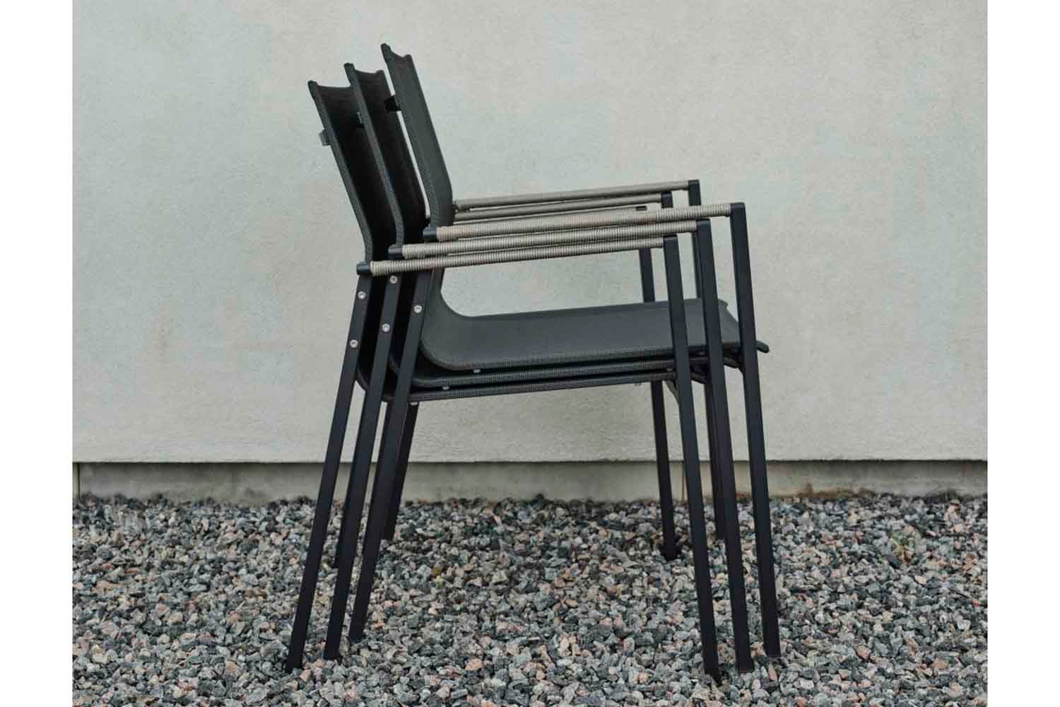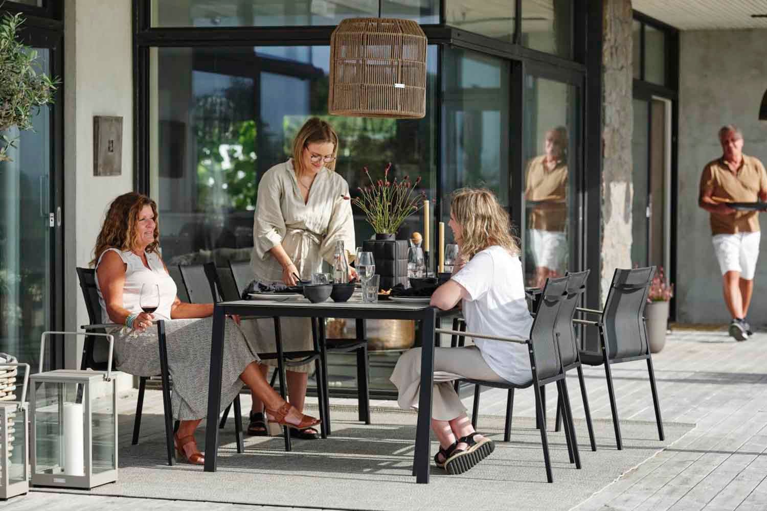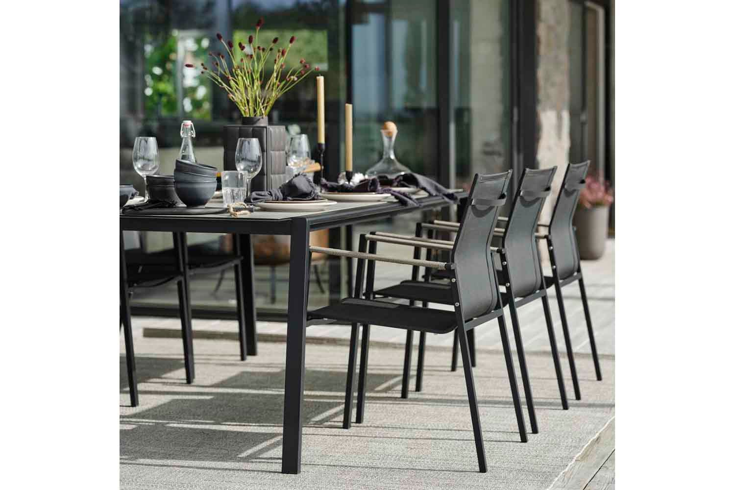 Lyra er en moderne og veldig nøktern serie i en nydelig blanding av materialer. Svart pulverlakkert ramme i rustfritt stål (304) perfekt for å takle forskjellige værforhold. Vakre detaljer av kunstig rotting på armlenene.