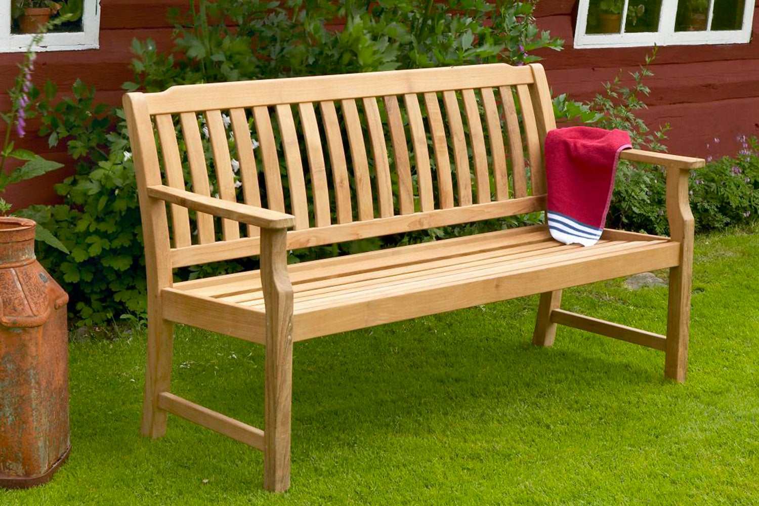 Stabil sofa i teak av høy kvalitet som er ideell som kabal i hagen.