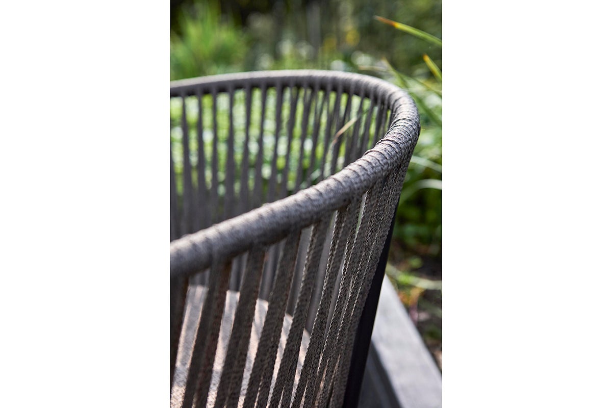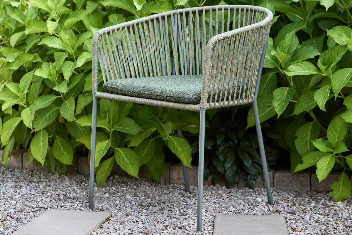 Piatto, spisestolen som kombinerer komfort og holdbarhet med sin solide stålramme, designet for utendørs bruk samtidig som den er vakker og stilig. Setet og ryggen er laget av brede, vevde tau som gir komfortabel støtte og gir et snev av håndverksmessig eleganse til utemiljøet ditt. Pute inkludert for ekstra komfort.