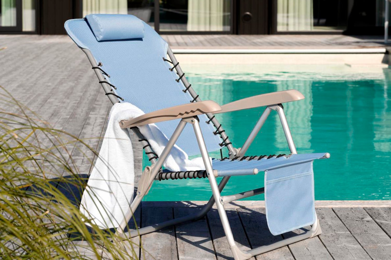 Ryddig og stabelbar strandstol med aluminiumsramme og slitesterk polyester. Lomme foran.