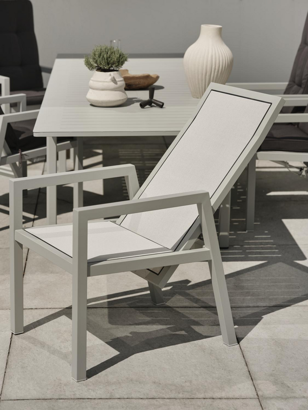 En posisjonsstol med stativ i pulverlakkert aluminium. Ryggen og setet er utstyrt med slitesterk textilene. Dimensjonene er maksimert for å imøtekomme både oppreiste samtaler og foldede avslapninger. For ekstra komfort: Legg til en sittepute, gjerne fra Iduna-serien. Newfort er perfekt for Lomma-, Lyon-, Nox- og Hillmond-bord.